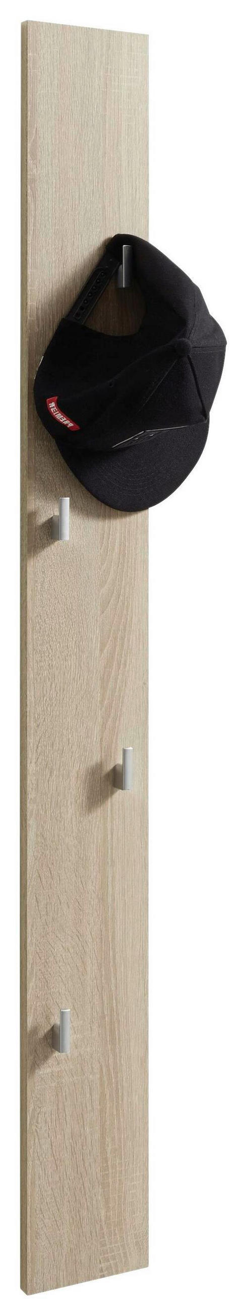 Dieses Garderobenpaneel in Eichefarben mit 4 Haken ist eine zeitlose Einrichtungsidee für den Eingangsbereich. Eine Dekorfolie verleiht dem ca. 14 x 115 cm (B x H) großen Element seinen frischen Look - so lässt es sich vielseitig mit modernen Wohnstilen kombinieren. Durch die Wandmontage unterstützt das Möbel ein unbeschwertes Ambiente.