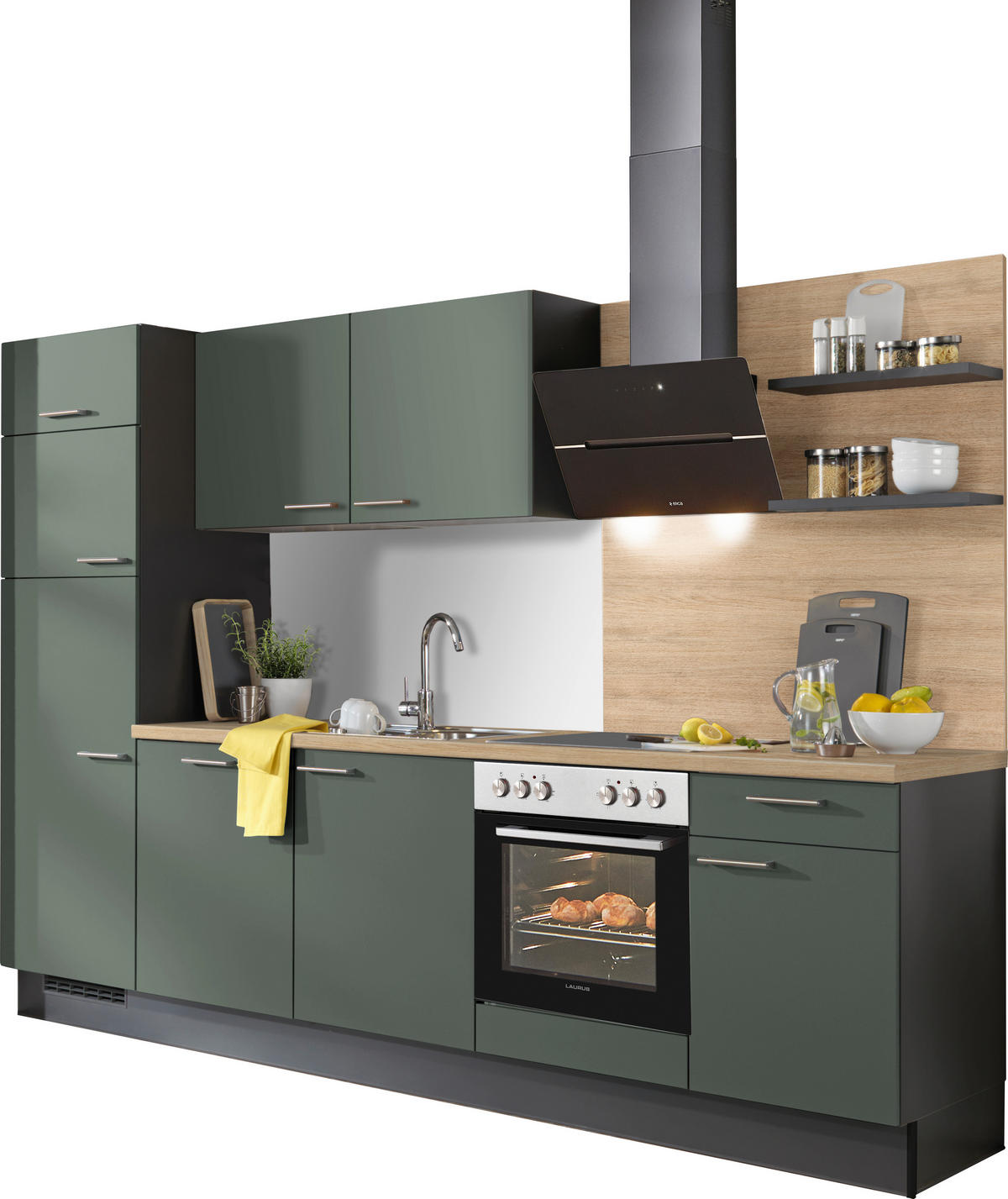 KÜCHENBLOCK 290 cm   in Graphitfarben, Eichefarben, Dunkelgrün  - Dunkelgrün/Edelstahlfarben, Design, Holzwerkstoff/Metall (290cm) - Xora