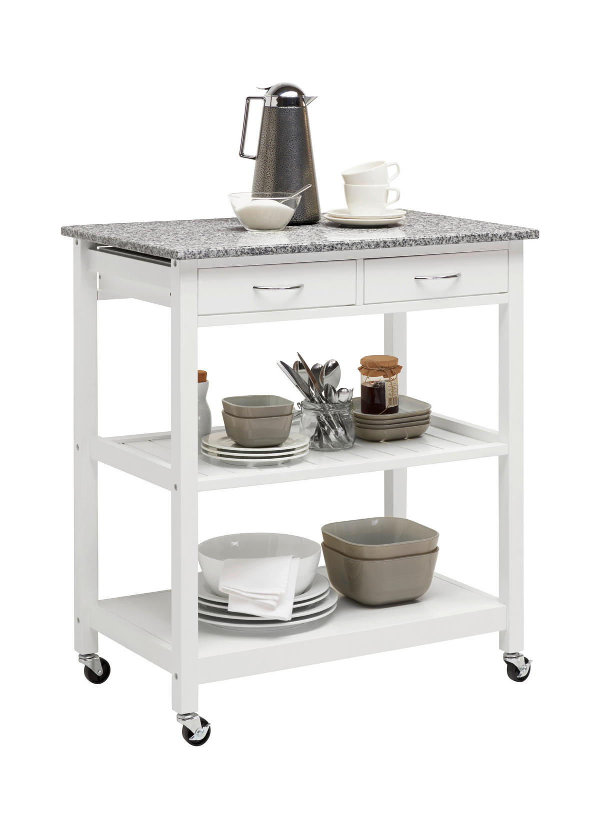 2 Schubladen eignen sich zum Beispiel für Besteck oder Kerzen. Beim Kochen macht sich das Möbel als zusätzliche Ablage nützlich: Neben den Herd gerollt stehen alle Zutaten griffbereit. Dank der Platte aus