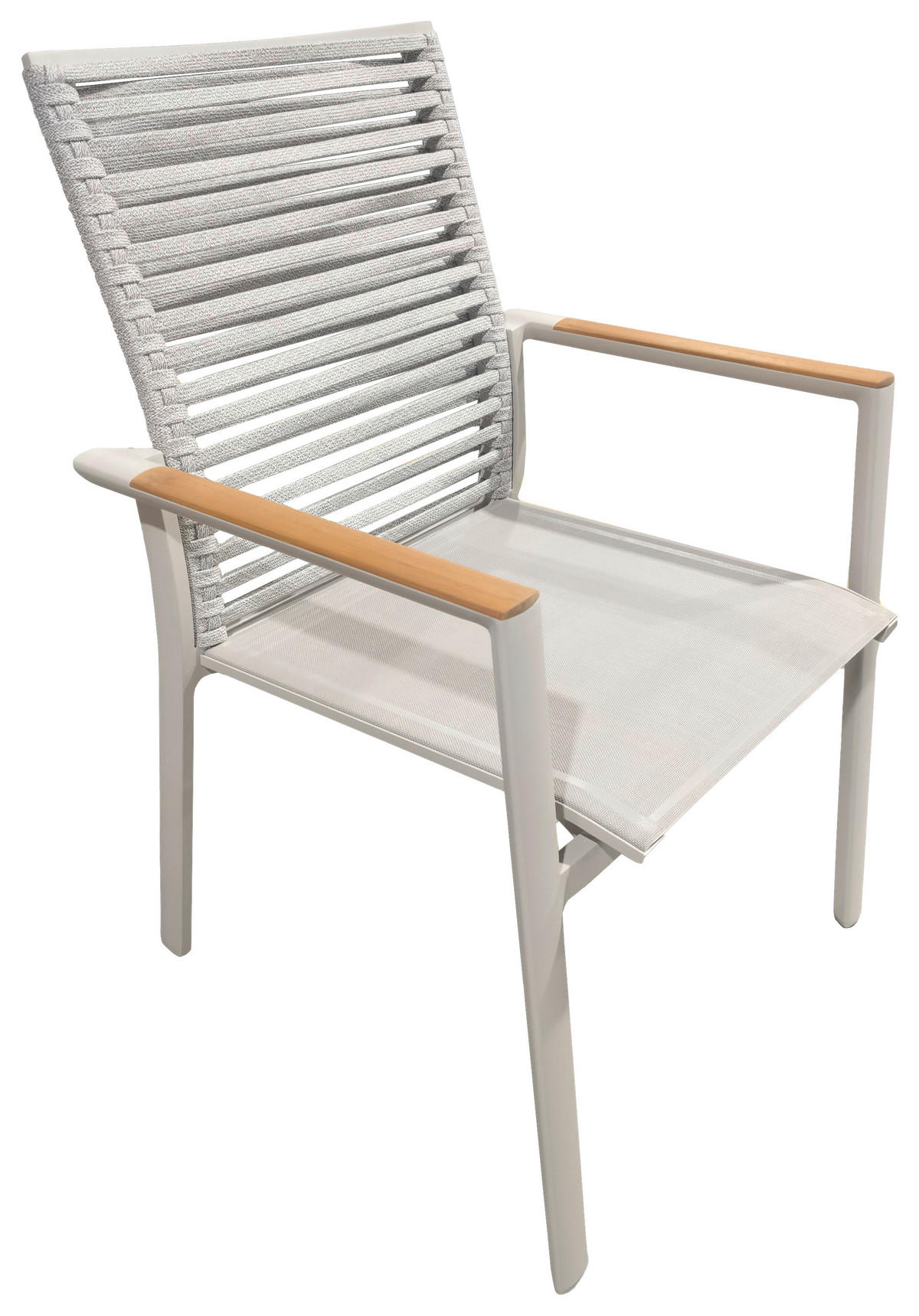 Stylischer Materialmix: Stapelsessel in Sandfarben mit Teakholz